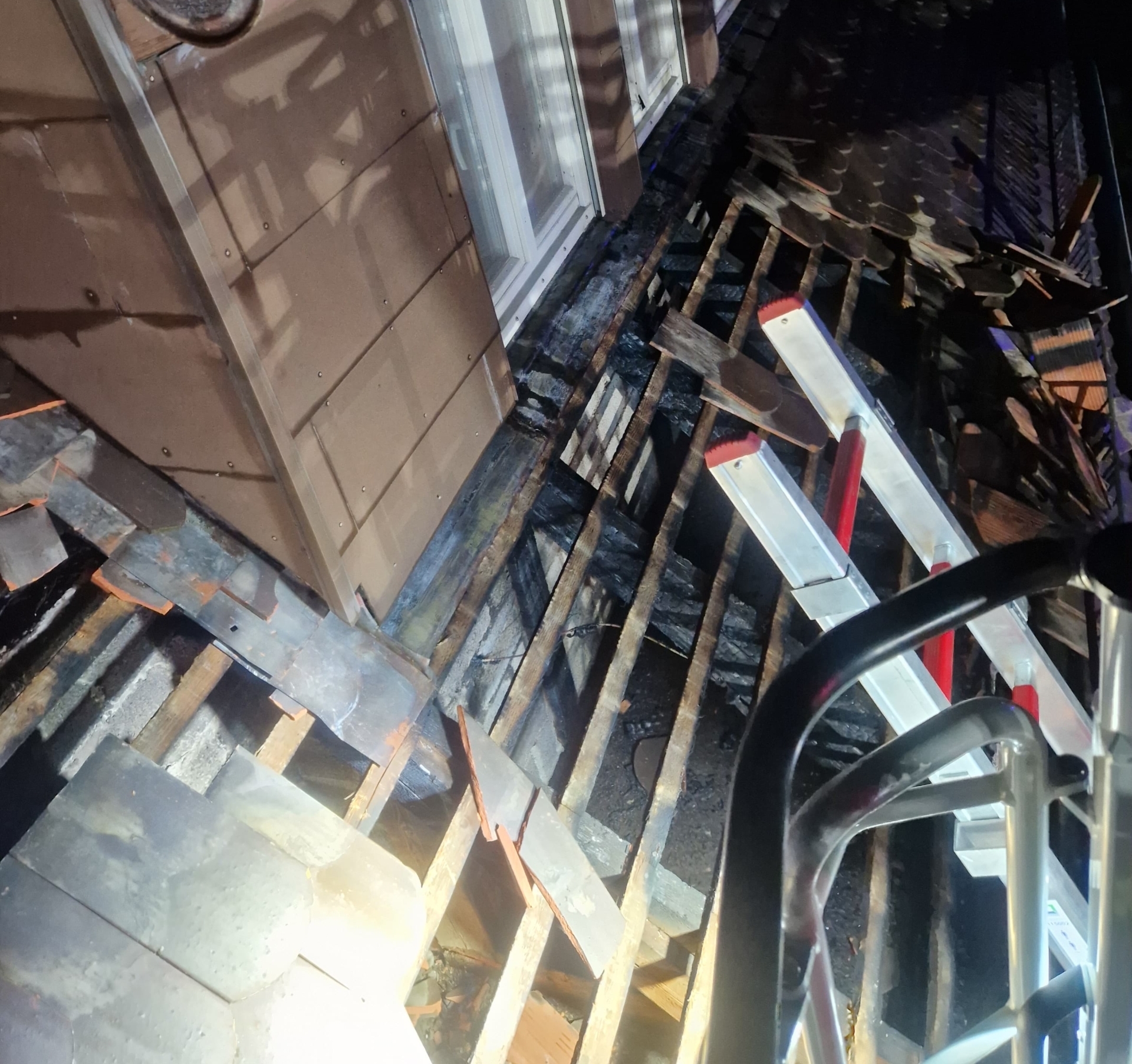 Abgelöschter Brand durch die Feuerwehr Baienfurt. Abdecken eines Teilbereiches der Dachhaut bis zur Gaupe zur optischen Kontrolle und Kontrolle mit Wärmebildkamera über Drehleiter.