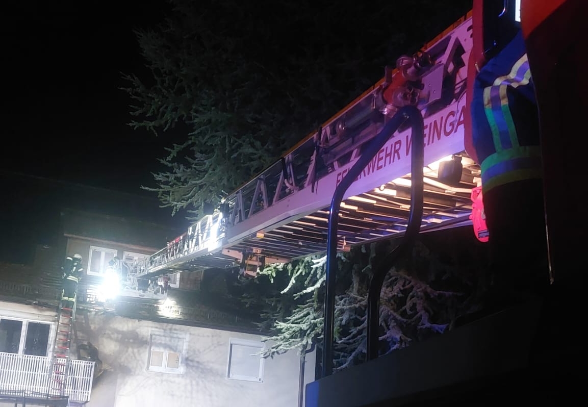 Nachforderung der Drehleiter zu einem Brand, der vom Balkon auf die Dachhaut übergegriffen war.