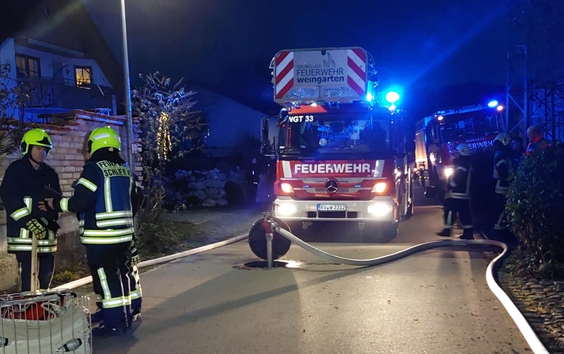 Gemeldeter Kaminbrand in Schlier/Ankenreute. Drehleiter vor Ort in Bereitstellung. Die Feuerwehr Schlier konnte den Brand schnell unter Kontrolle bringen.