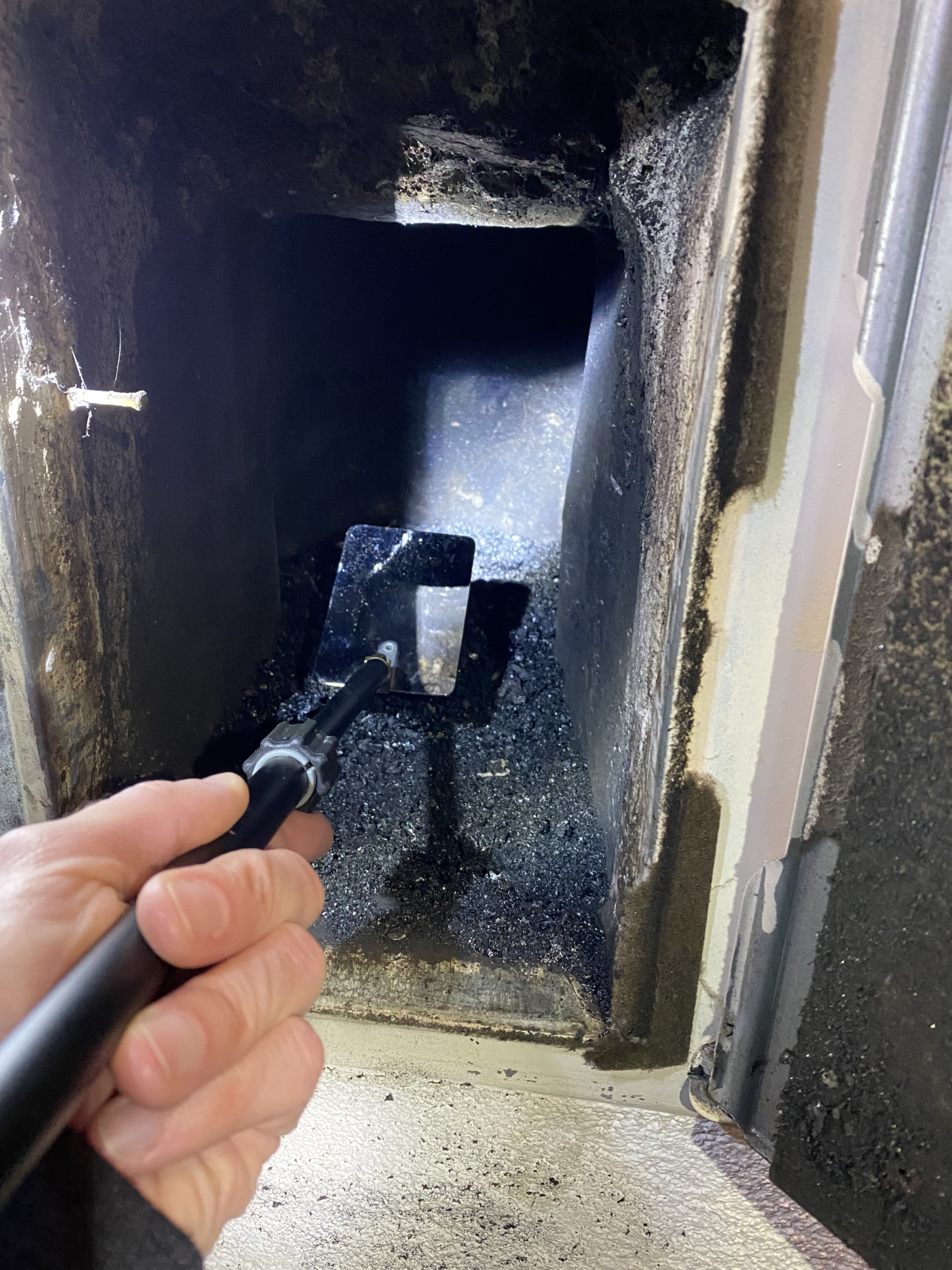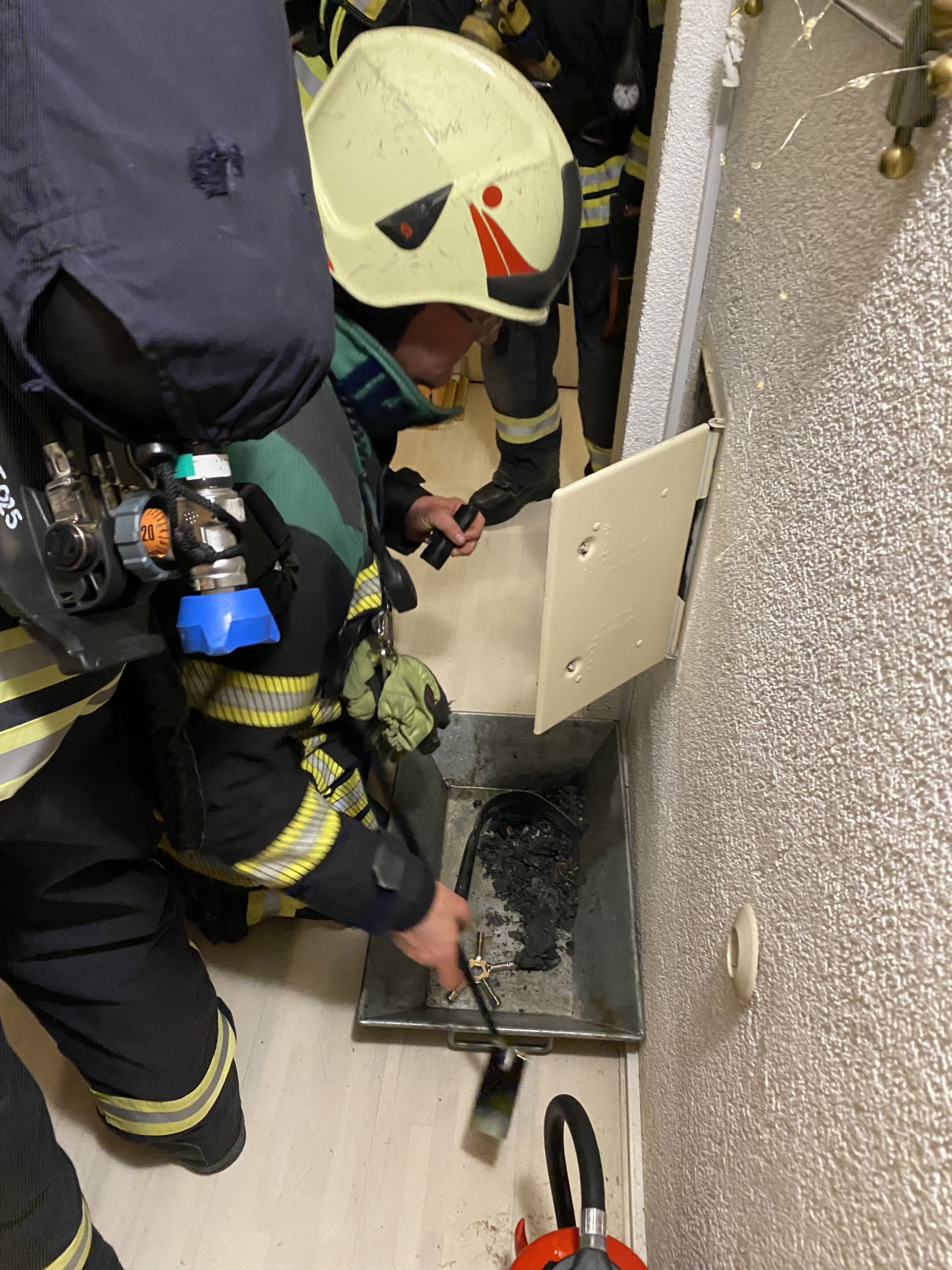 Feuerstätte ausgeräumt, Löschangriff in Bereitstellung, Wohnungen kontrolliert und überwacht. Schornstein mit Brandkehrgerät mehrfach gekehrt, später noch von Schornsteinfeger nachgekehrt.