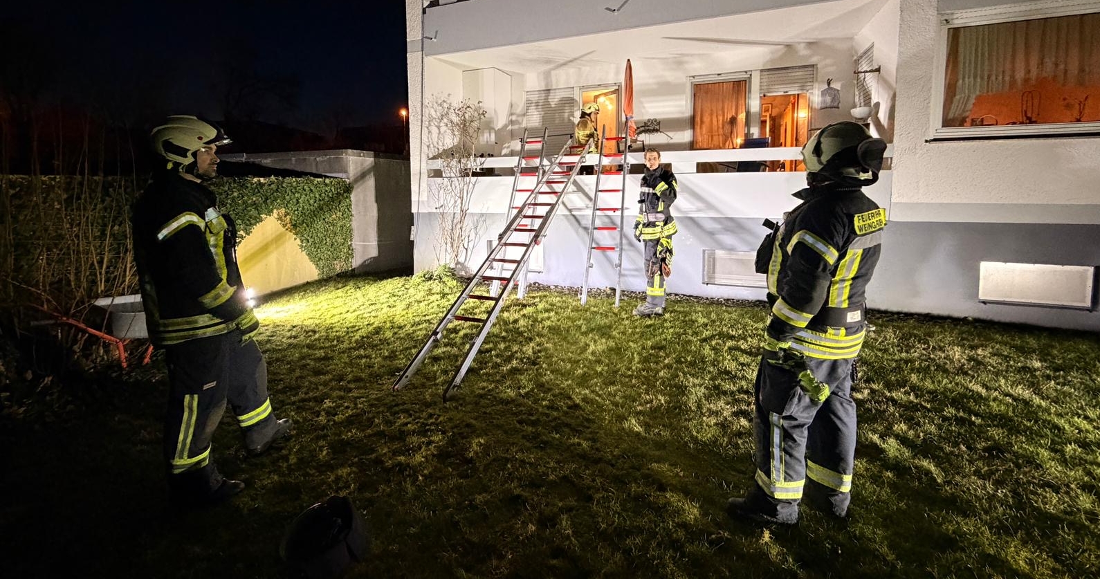 Hilflose Person in einem Mehrfamilienhaus. Türöffnung zerstörungsfrei. Erstversorgung der Patientin da Rettungswagen aus Altshausen auf Anfahrt. Anschließend Unterstützung des Rettungsdienstes. Rettung mit Schleifkorbtrage und Steckleitern über Balkon.