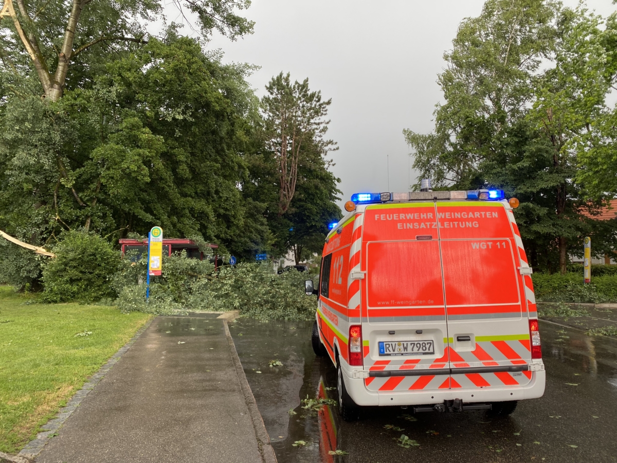 Zwei große Äste durch Sturm abgerissen und drohen auf eine Bushaltestelle zu fallen. Mit Hilfe von der Drehleiter die beiden Äste abgesägt und auf einer Wiese gelagert.