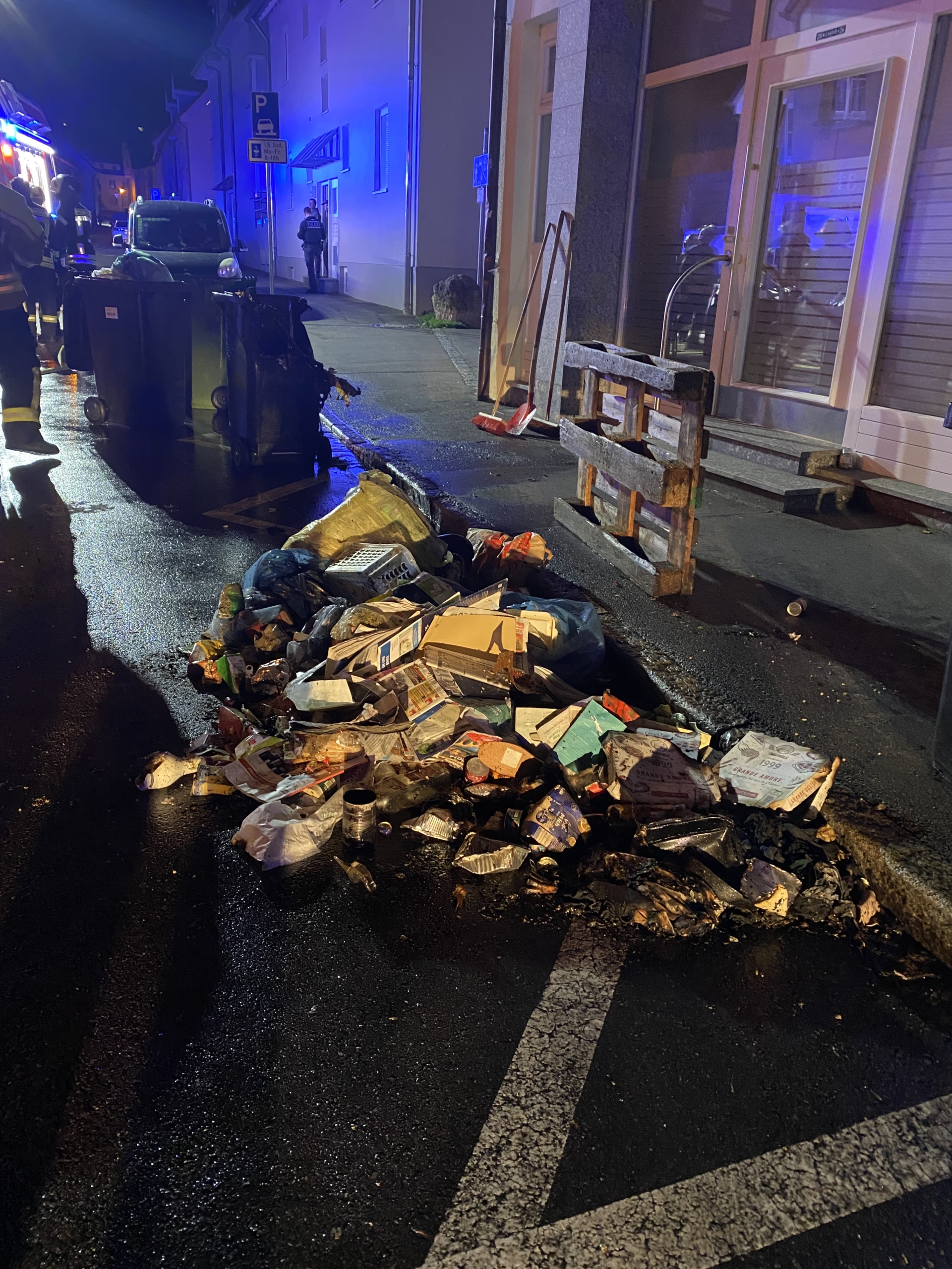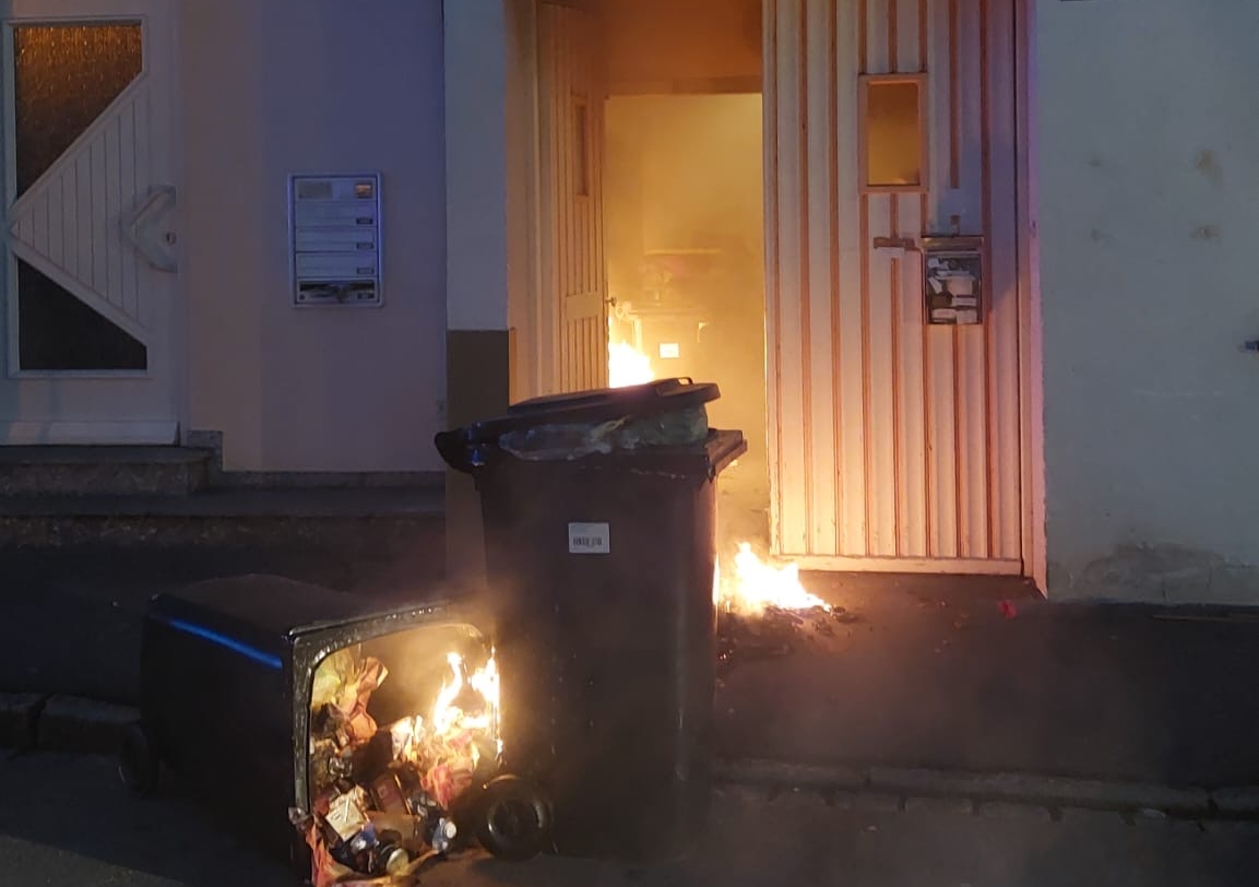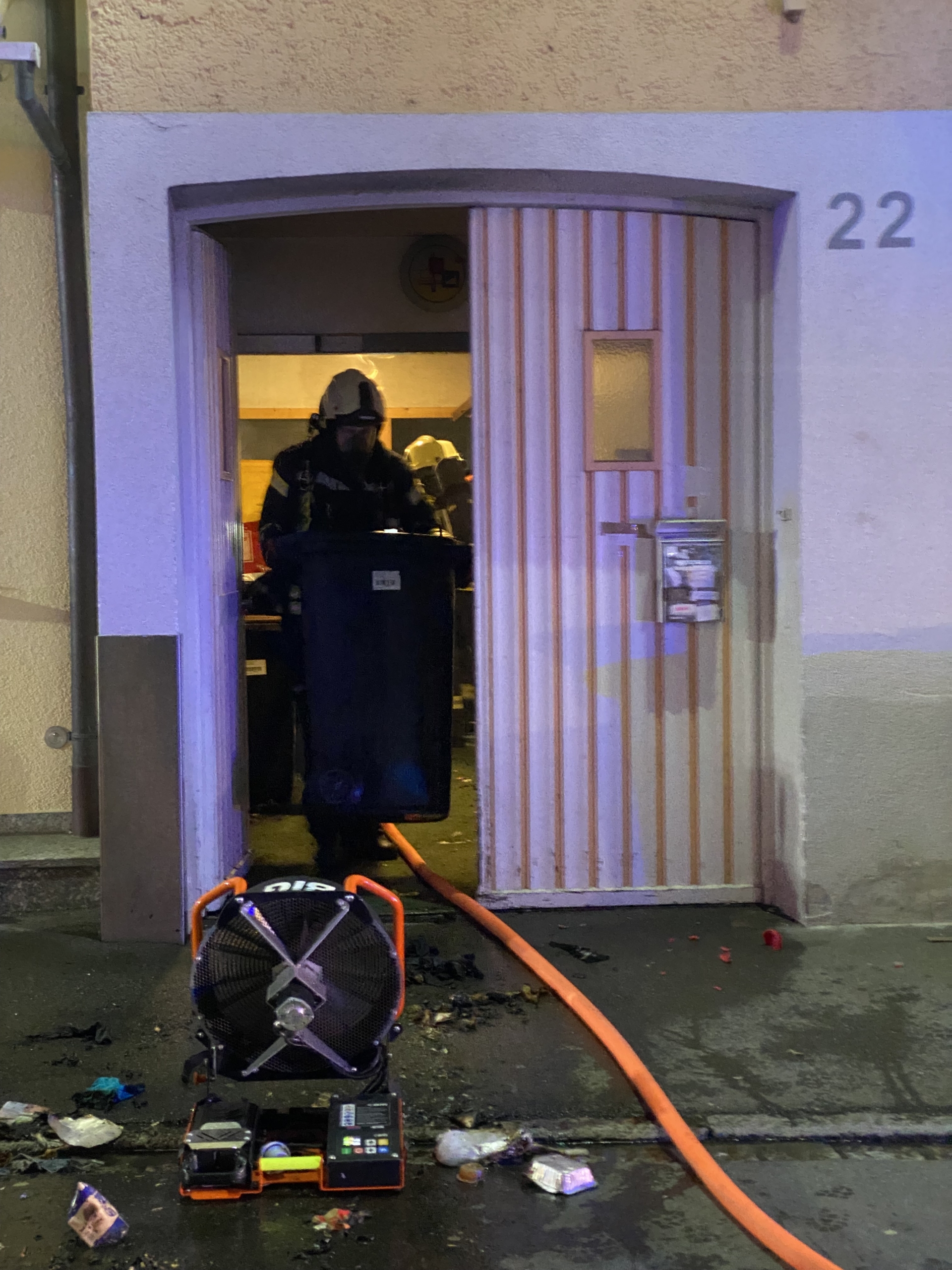 Brand von Mülleimern, Paletten und Mobilar im Eingangsbereich zum Erdgeschoss mit starker Rauchentwicklung. Bewohner zerrte 1 brennenden Mülleimer aus dem Haus ins Freie. Eingang in die Obergeschosse separat. Bewohner bereits im Freien sowie weitere von uns evakuiert.