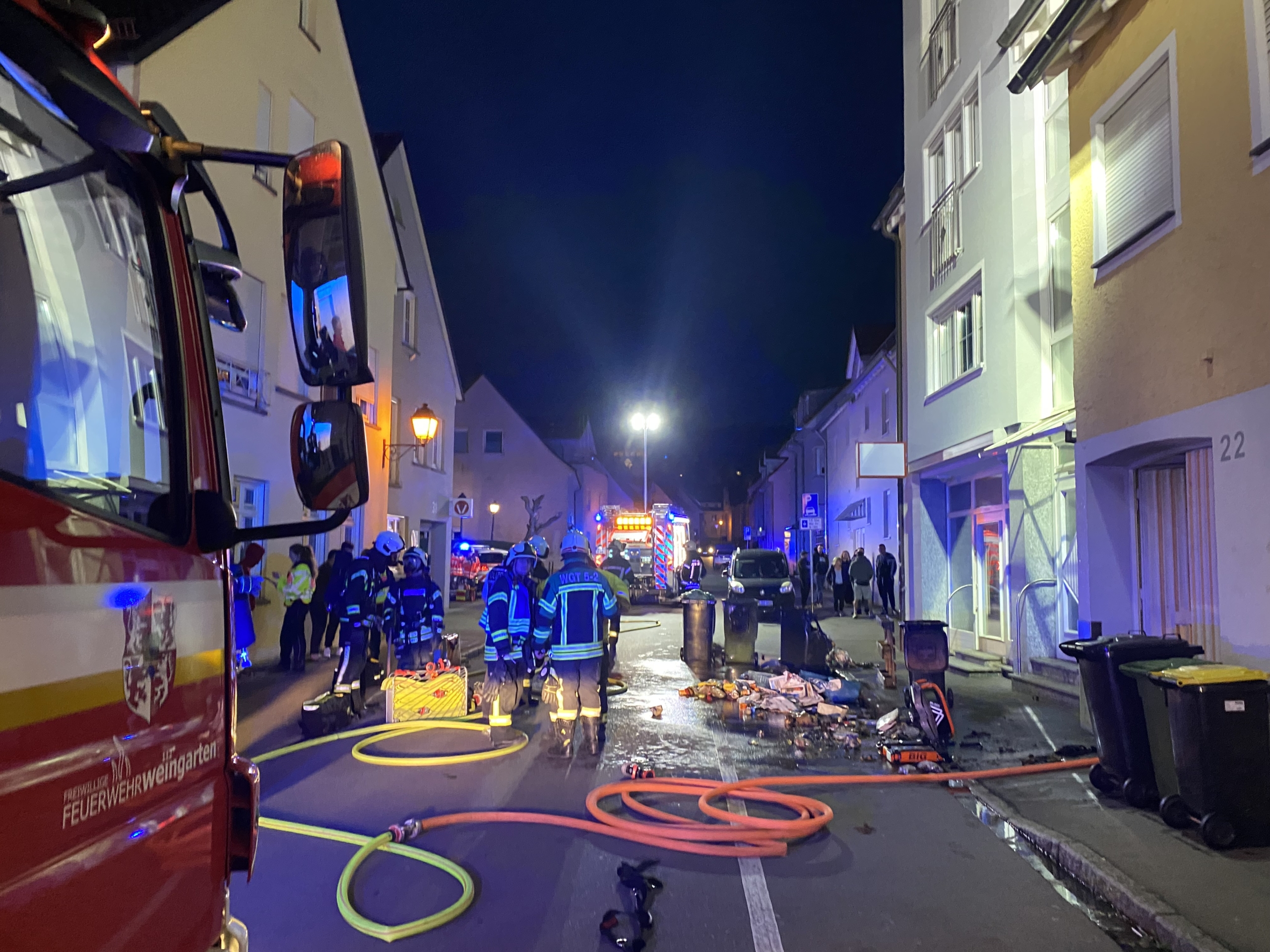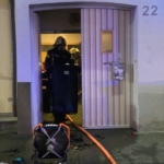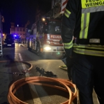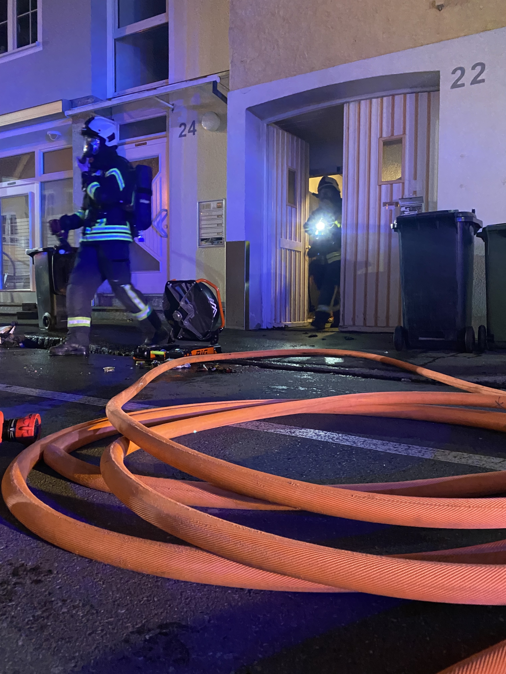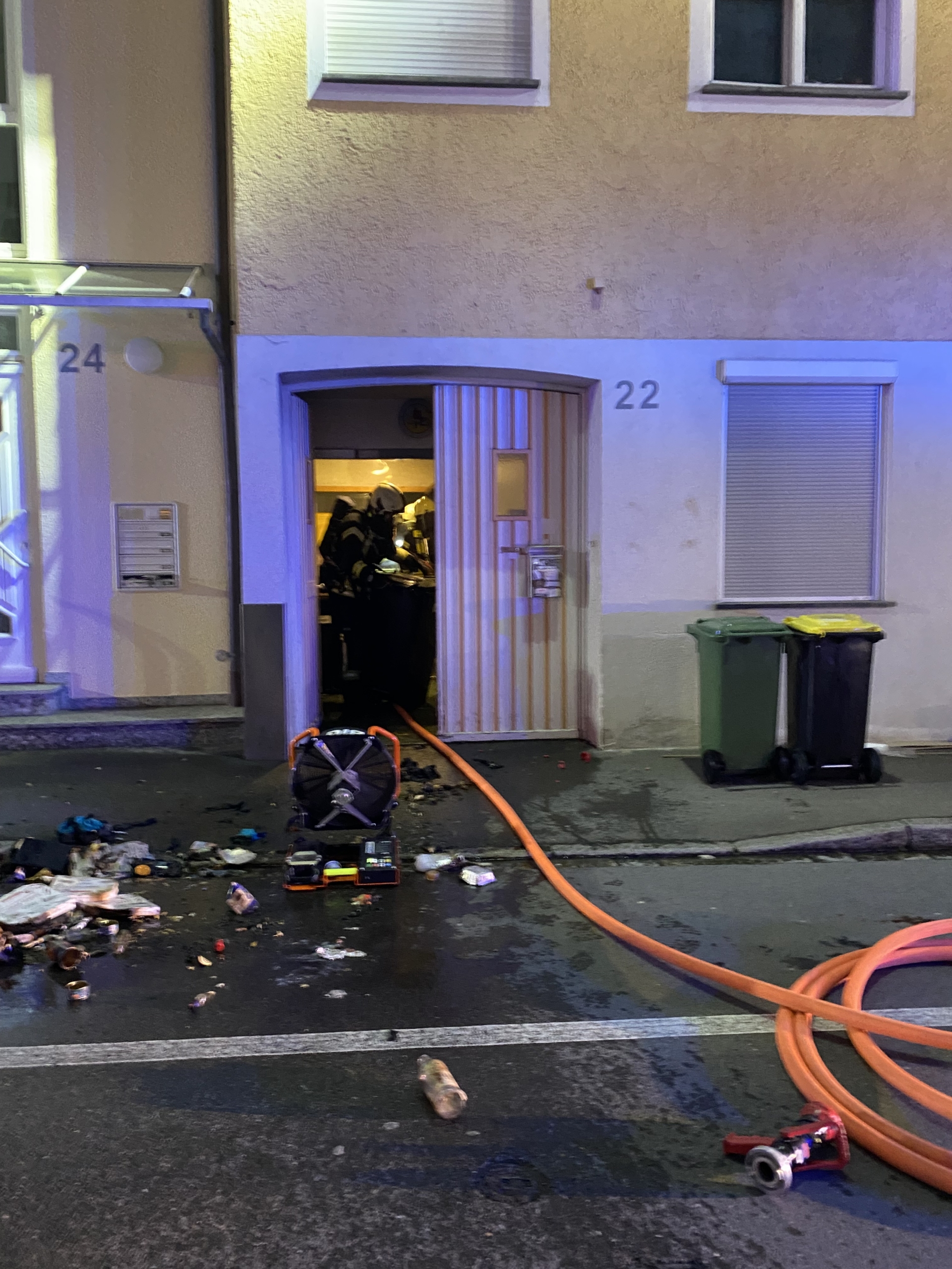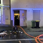 Innenangriff unter Atemschutz mit 1 C-Rohr. Teilweise rerausräumen des Brandgutes und weiteres ablöschen. Kontrolle des Obergeschosses durch Atemschutztrupps. Belüftungsmaßnahmen mit Drucklüfter zur Entrauchung. Ein Übergriff des Brandes auf das Gebäude konnte noch verhindert werden. Es waren mindestens 2 getrennte Brandstellen im Erdgeschoss. Von Brandstiftung kann ausgegangen werden. Brandort war ein mit Mülleimern und Unrat zugestellter Eingangsbereich, der bis in den Hinterhof ging und auch den Fluchtweg aus dem Erdgeschoss darstellt.